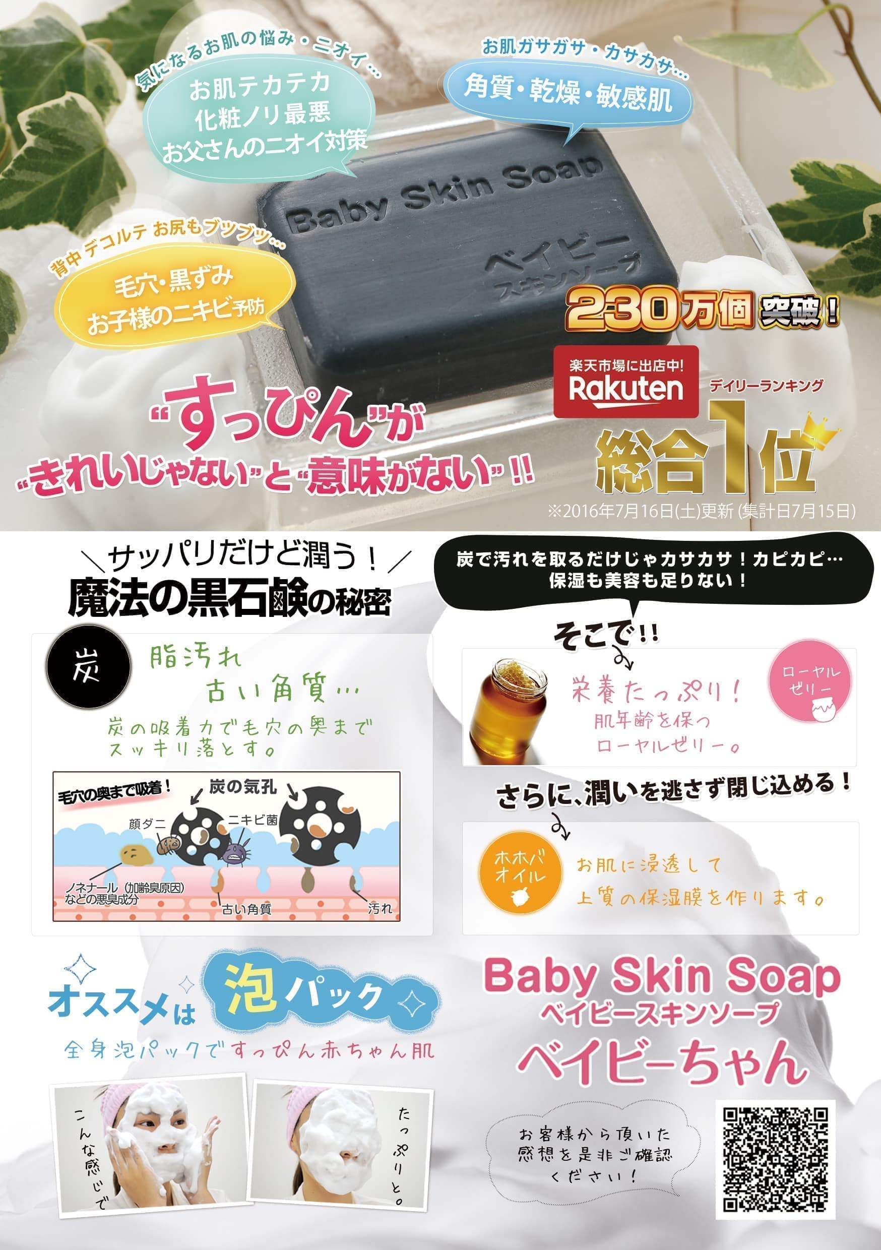 当社オリジナル石鹸。楽天市場で【デイリーランキング総合1位】を獲得しました大人気の石鹸です。 炭・ホホバオイル・ローヤルゼリーの成分が絶妙に配合され「サッパリするけど潤う」不思議な石鹸です。 炭の気泡が汚れやニオイの原因を吸着し、ホホバオイルが上質な保湿膜を作り、ローヤルゼリーがお肌に栄養を与えてくれます。 毛穴・黒ずみ・ニキビ予防・体臭・加齢臭・敏感肌など、お肌のお悩みを解決してくれます! 多くのお客様に愛用され、「出荷個数230万個突破(※令和2年4月末現在)ミニ石鹸含む」をしております。 お顔だけでなく全身に使えます!泡パックもおすすめです。 >>楽天市場の口コミはコチラ<< >>商品詳細はコチラ(ベイビースキンソープ楽天市場店)<<